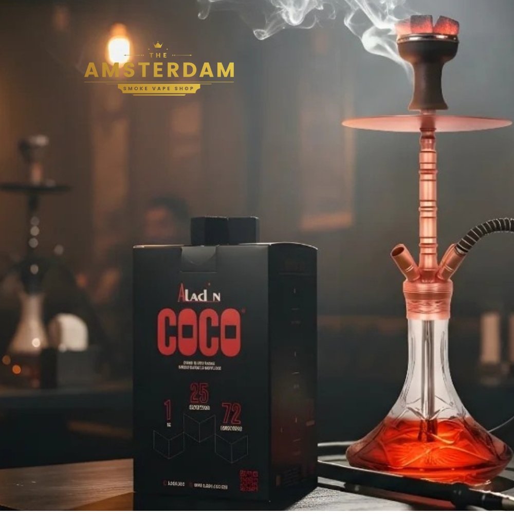 Aladin Coco Charbon premium en coco naturel. 100 % naturel, sans odeur ni additifs chimiques. Combustion propre avec chaleur stable et longue durée.